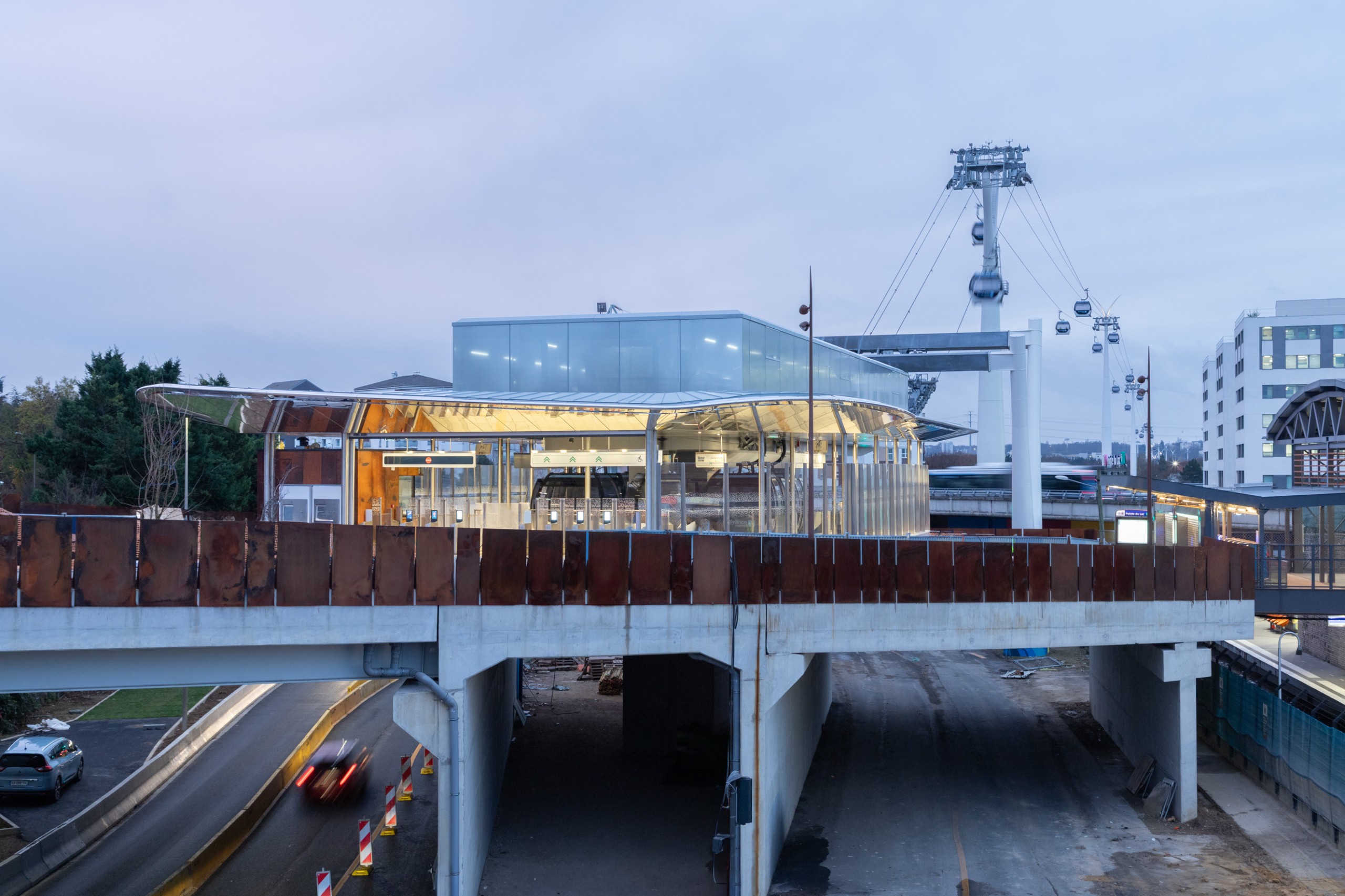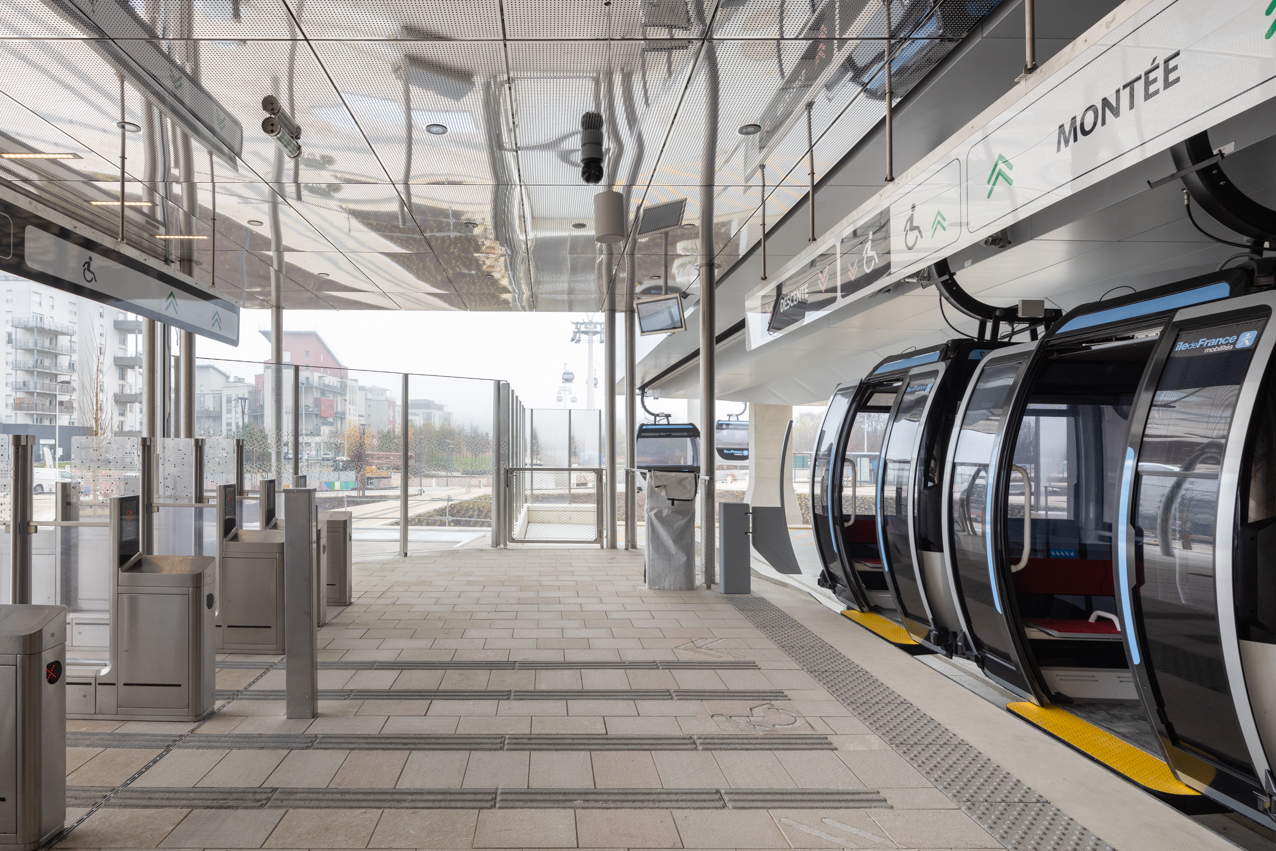 Le Câble 1 n’est pas seulement une infrastructure aérienne. Ses gares ont été conçues comme des prolongements directs de l’espace public. L’accès aux quais se fait de plain-pied, par un travail précis du sol et de la topographie. Les stations s’inscrivent dans leur contexte par la matière : acier corten, bois, béton strié, pierre, tout en déployant un vocabulaire commun à l’échelle de la ligne : métal, verre, auvents légers. L’architecture se réduit à l’essentiel pour privilégier la lisibilité des parcours, la continuité du paysage et le confort d’usage.