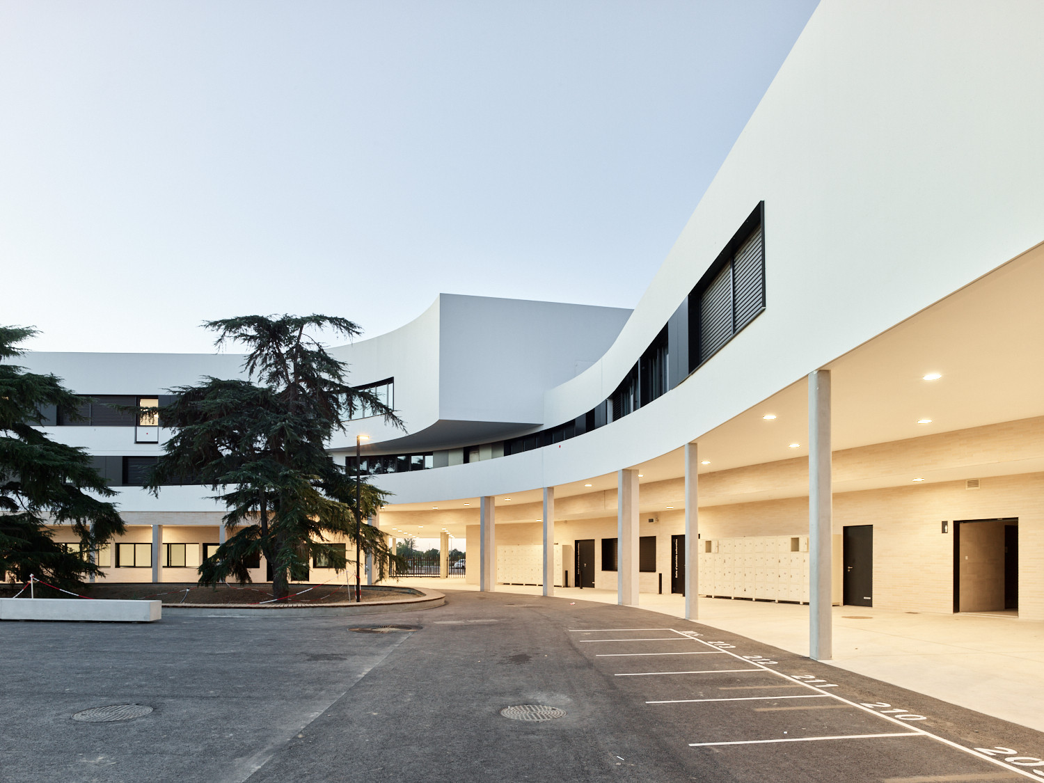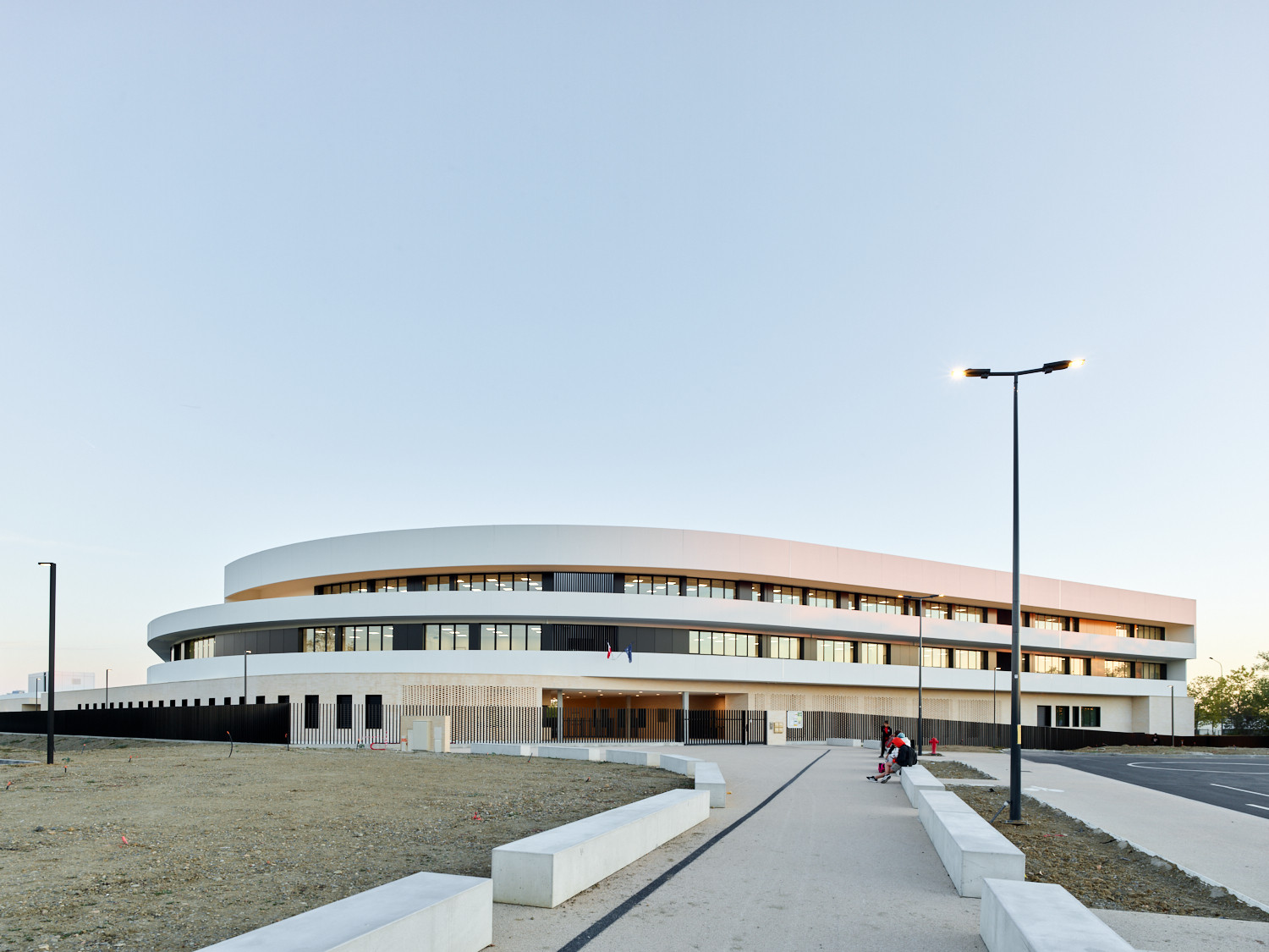 Construit en béton bas carbone et en brique de terre cuite, l’établissement s’intègre au paysage tout en marquant le futur centre d’activités de ce quartier en développement.