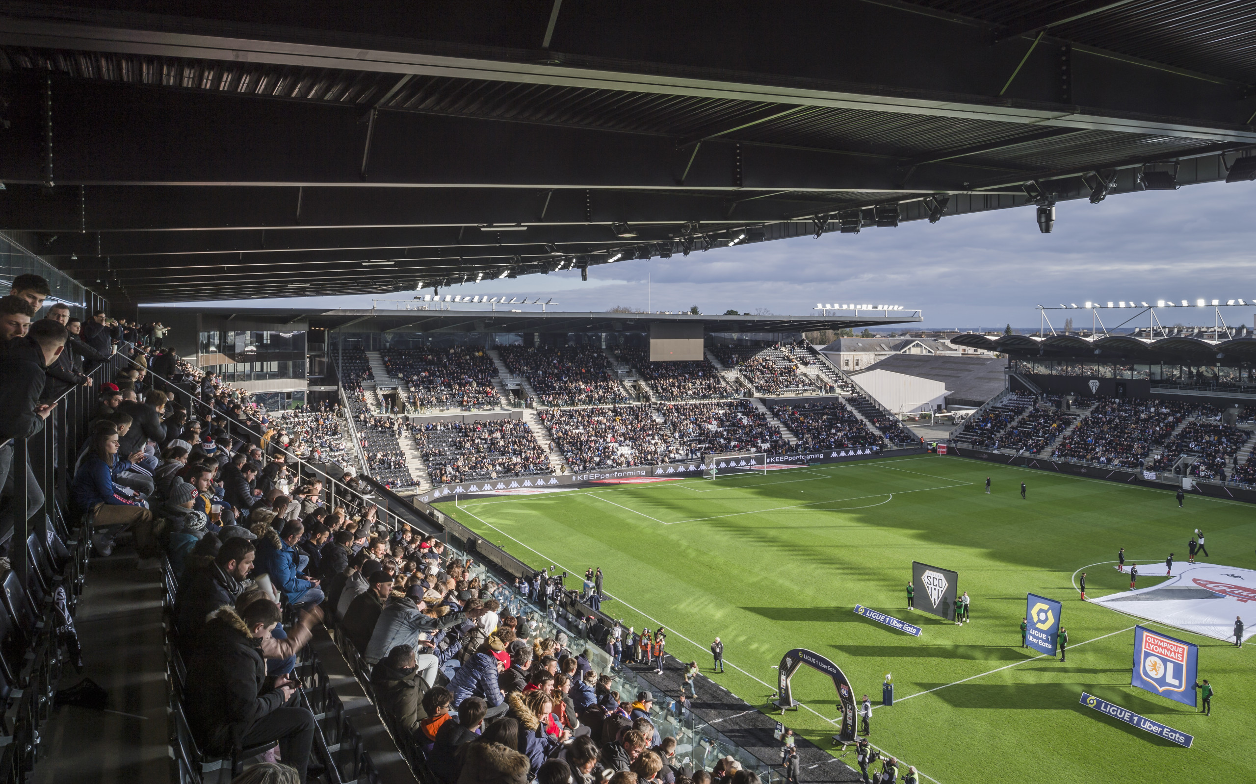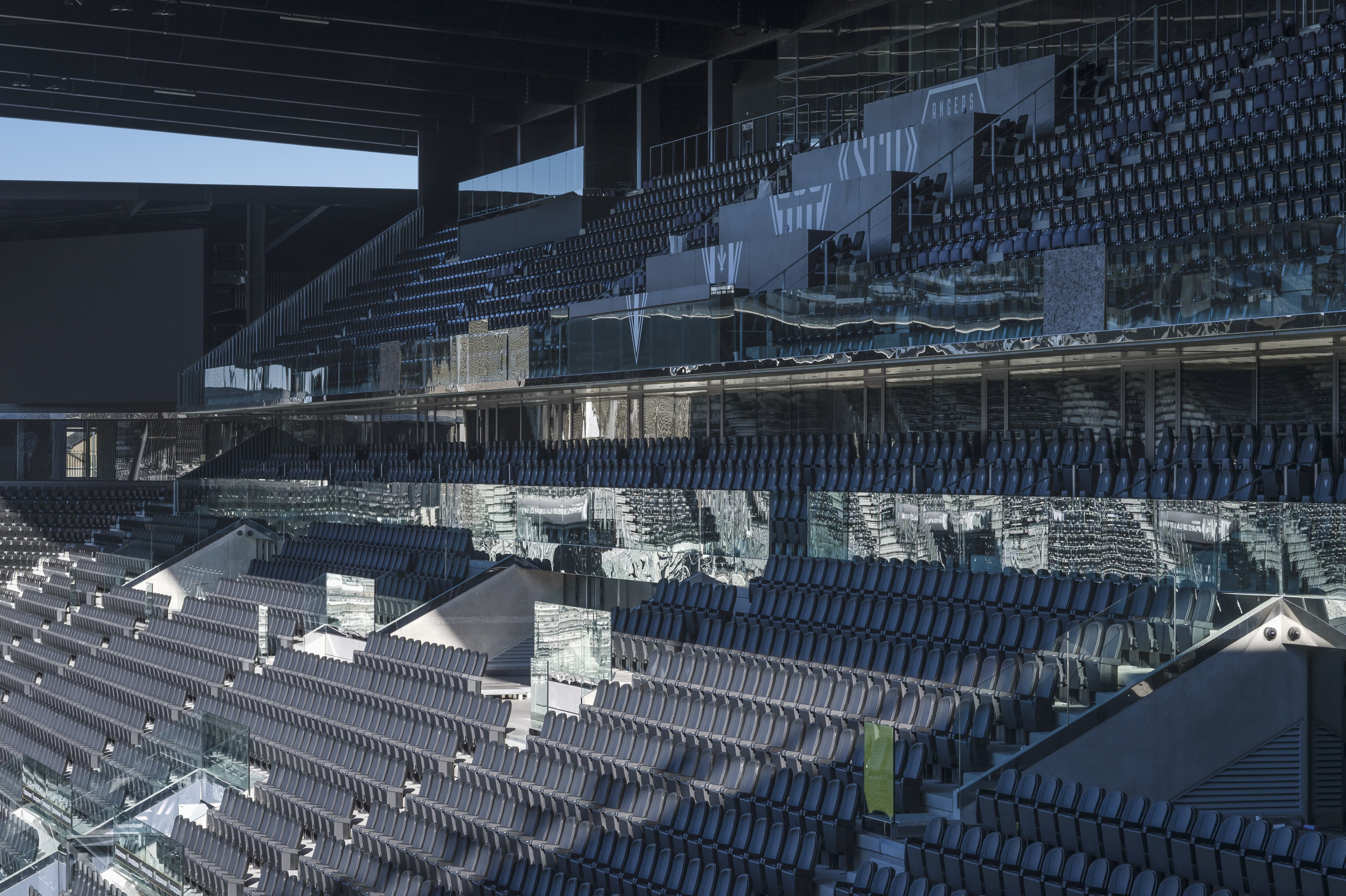 Long de 200 mètres, l’équipement s’intègre dans le tissu urbain et arbore des façades noires aux couleurs du club Angers SCO, conçues pour réagir à la lumière. Sa conception bioclimatique traduit un engagement fort en faveur de la qualité environnementale.