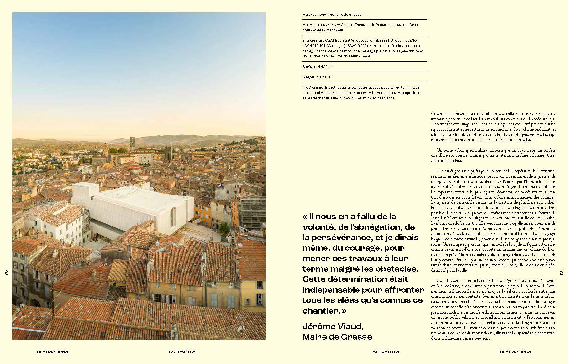 Pour la médiathèque Charles-Nègre de Grasse, lauréate de l’Équerre d’argent 2022, Comme on vous parle a réalisé les textes de présentation à partir d’entretiens avec les architectes Emmanuelle et Laurent Beaudouin, Ivry Serres, et l’ingénieur Jean-Marc Weill.
